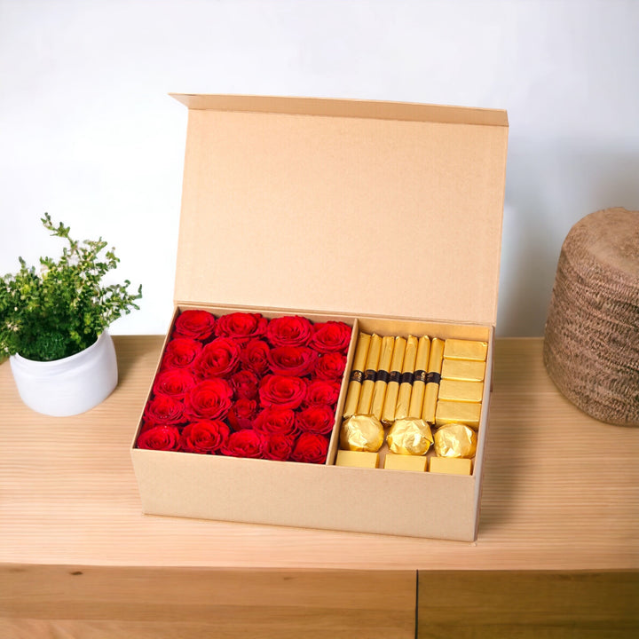 صندوق ملكي من الورود الحمراء والشوكولاتة