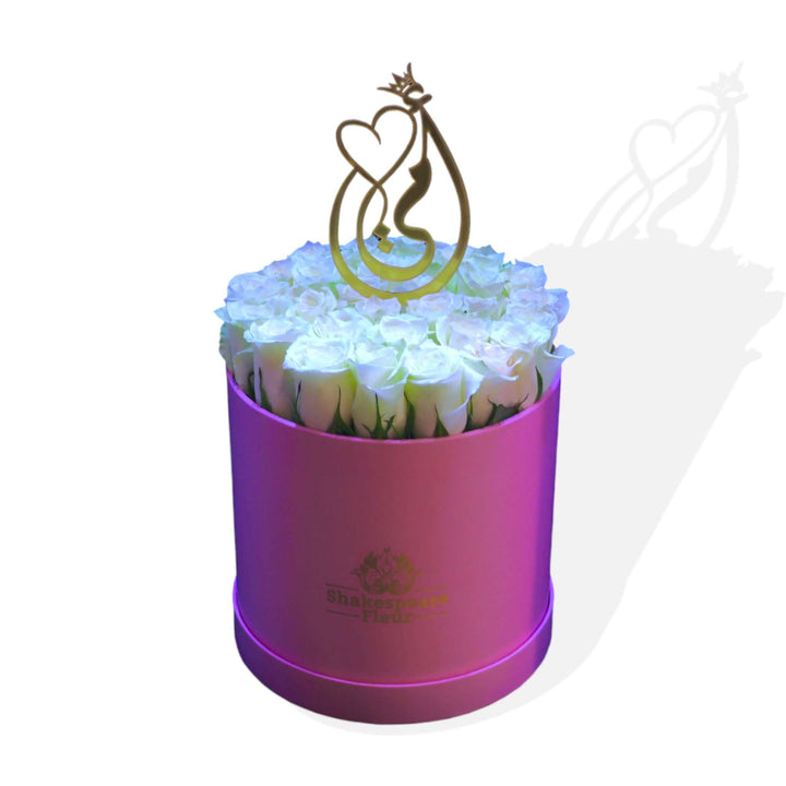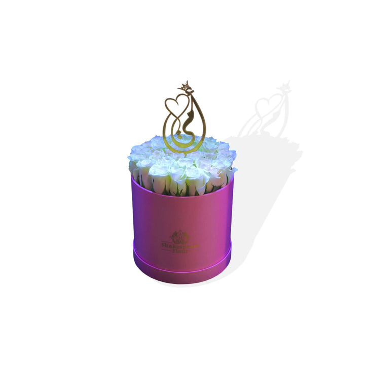 This elegant arrangement includes 25 pristine white roses, beautifully presented in a Shakespeare pink box. Paired with a "My Mom" acrylic word for a personal touch. Ideal for bouquet Dubai, ensuring fresh and elegant floral arrangements.