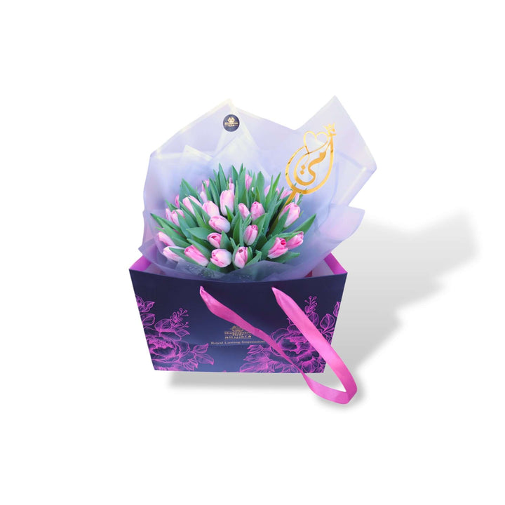 This beautiful bouquet includes 30 pink tulips, arranged in transparent paper and presented in a Shakespeare floral bag. Elegantly paired with a "My Mom" acrylic word. Available for online rose delivery, bringing elegance to any occasion.