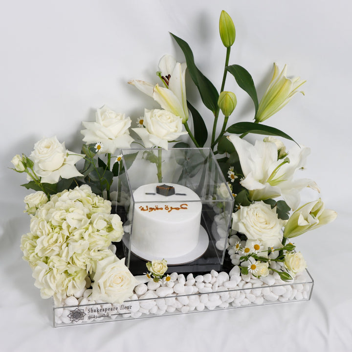 من 5 ورود بيضاء، 1 هايدرنجا بيضاء، 1 زنبق أبيض، و50 زهرة استون بيضاء، جميعها مرتبة بعناية على استاند أكريليك شفاف. يأتي مع بوكس كيك أكريليك لذيذ لإكمال هذه الهدية المميزة. مثالي لإضفاء جو من البهجة والتعبير عن أطيب التمنيات بعمرة مقبولة ومباركة.