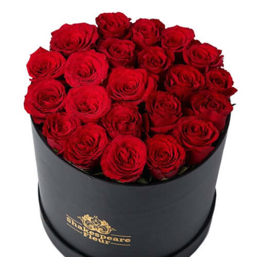 This exquisite box of red roses, featuring 24 stunning red rose flower bouquet, elegantly presented in a Shakespeare Signature box. Each arrangement comes with an 'I Love You' acrylic tag, making it a perfect choice for dubai bouquet delivery.