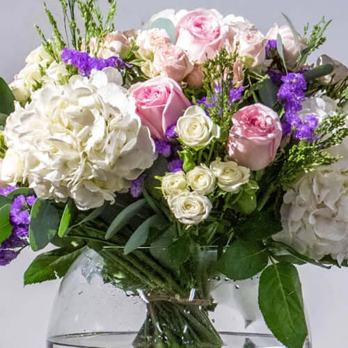 Blossom Diversity: Our skilled florists have expertly combined 3 delicate White Hydrangea stems, 5 charming Pink Roses, 5 graceful White Spray Roses, and 2 alluring Purple Statice stems, offering a captivating mix of textures and hues.