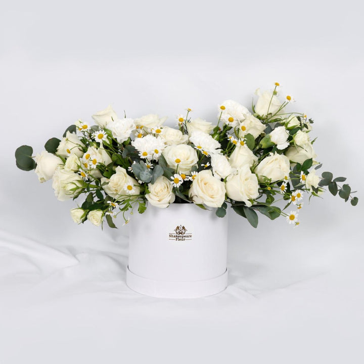 Indulge in the elegance of white with our Luxury White Flower Box. This exquisite arrangement features 15 white roses, 5 white corniche flowers, 4 green eucalyptus stems, and 4 white spray roses, all carefully selected to create a breathtaking display of beauty. Presented in a white Shakespeare cardboard box, this arrangement exudes sophistication and charm, making it a perfect gift for any special occasion.