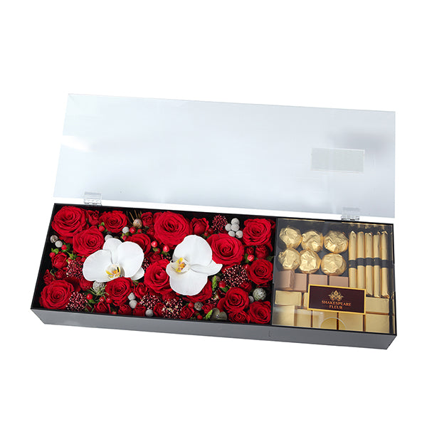 This stunning arrangement includes 17 Ever Red Roses, 6 Hybricom Flowers, 6 Baby Roses, 2 Flonbess Flowers, and 850g of mixed chocolates. Presented in a luxurious Shakespeare box, elegantly paired with premium chocolates. A luxurious choice for flower bouquet in Dubai.